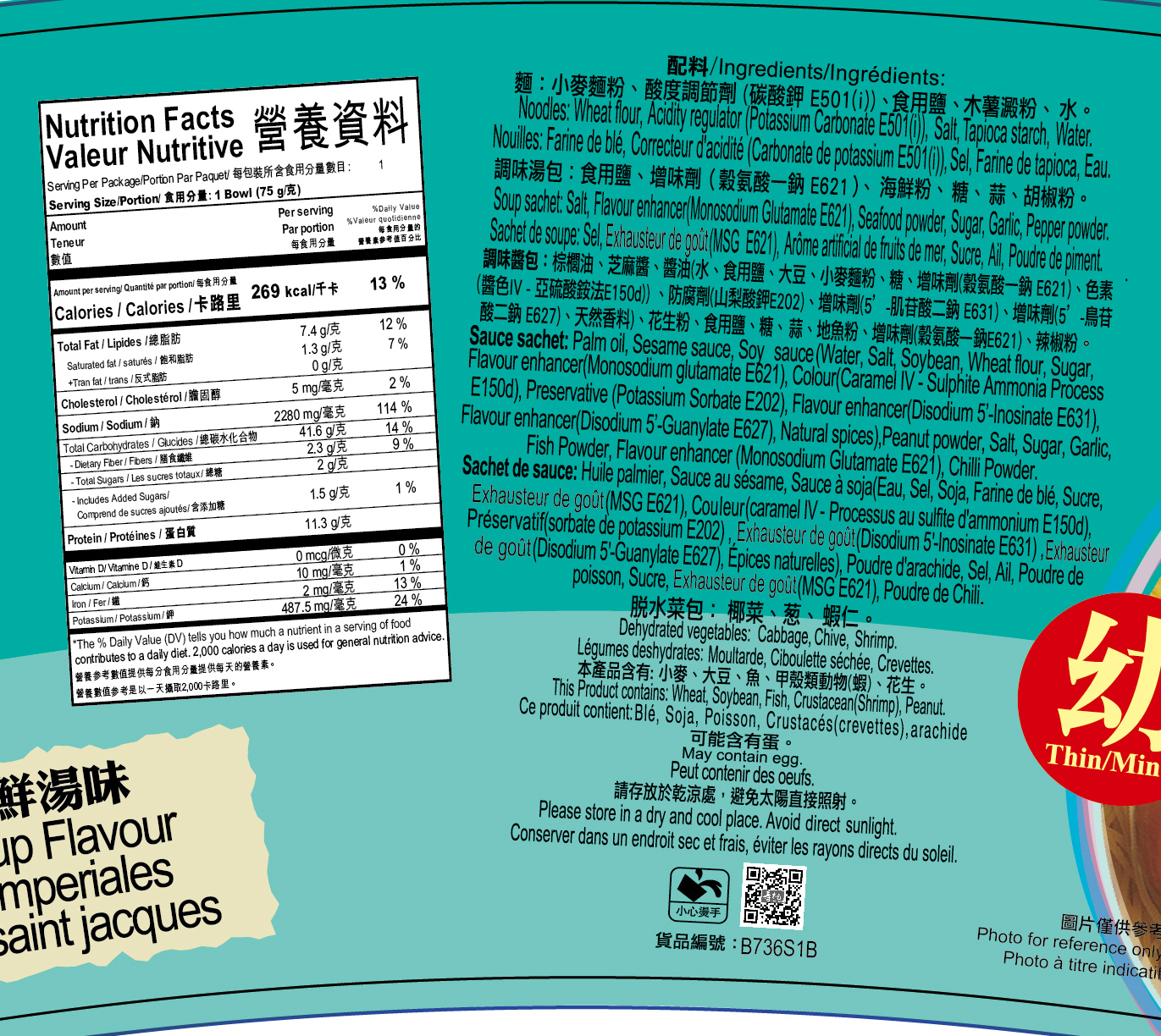 寿桃瑶柱海鲜味生面皇,鲜甜瑶柱海鲜味汤底配上非油炸面条更爽弹健康,简单易煮3分钟,无需过冷河也能保持面身口感爽滑弹牙。