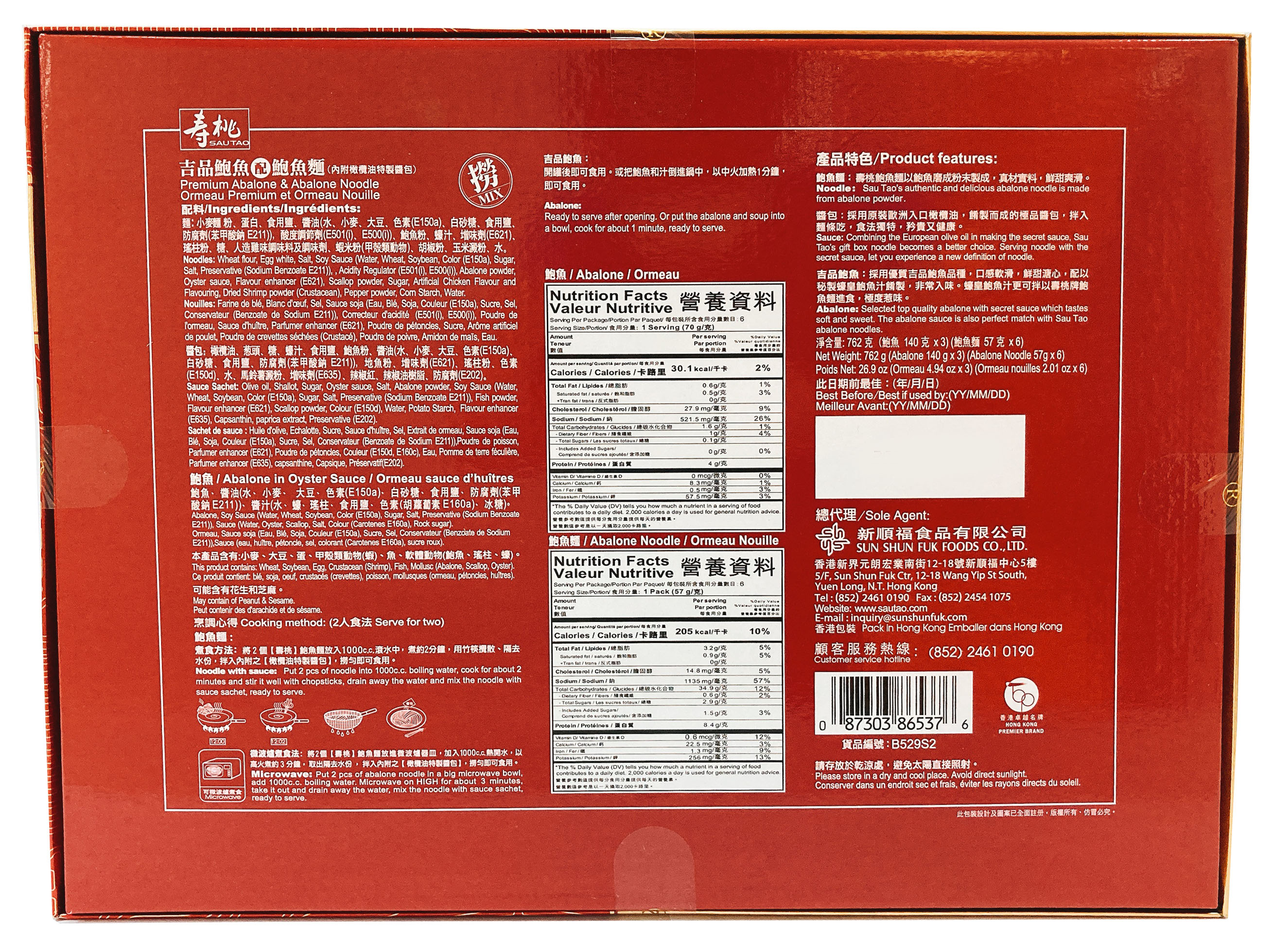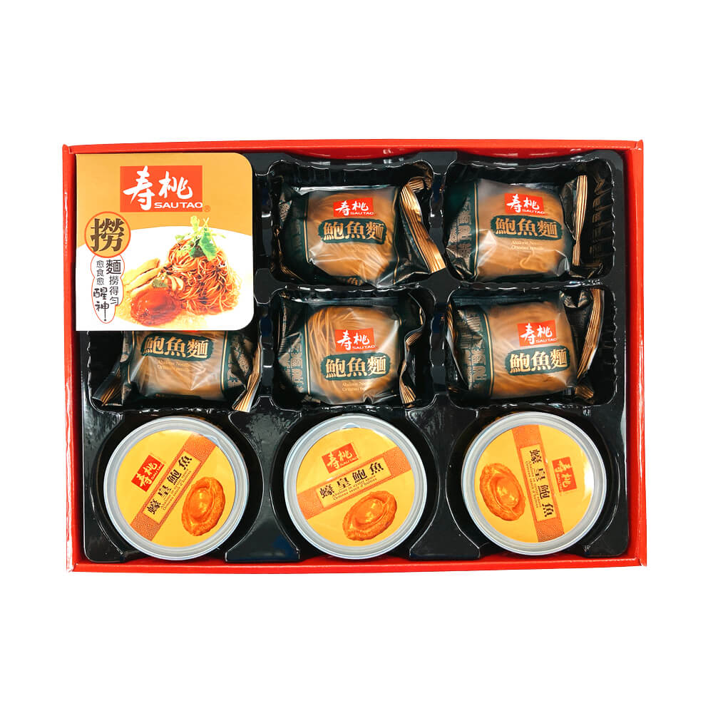 壽桃鮑魚麵以極品鮑魚製成,蘊含鮮味精華,一試難忘。配以歐洲入口的橄欖油而製成秘製醬油,醬汁鮮美濃郁,送禮自用皆宜。